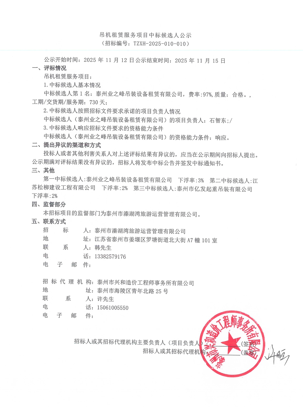 吊机租赁服务项目中标候选人公示