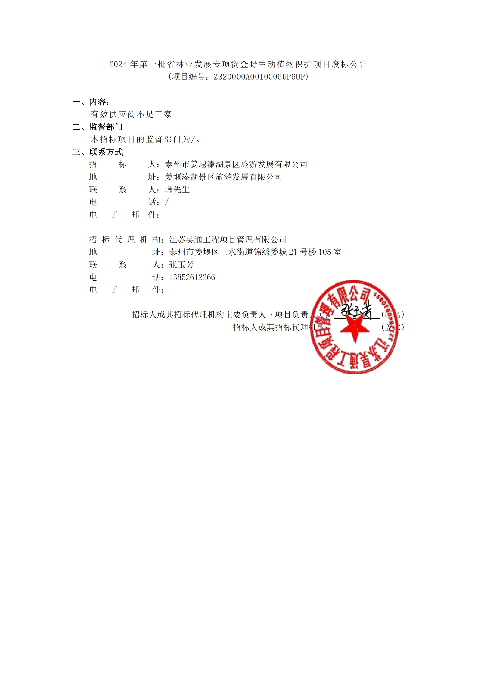 2024年第一批省林业发展专项资金野生动植物保护项目废标公告